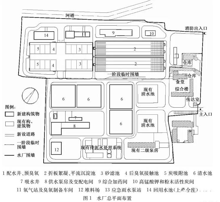 ?。?)構(gòu)筑物多、設(shè)備陳舊、總圖凌亂。水廠自建成的近60年時間里,先后經(jīng)歷多次擴容、改造,形成了現(xiàn)在多個處理構(gòu)筑物,總圖布置分散、凌亂,且多個構(gòu)筑物和很多設(shè)備都存在問題。如現(xiàn)有吸水井分為高、低水位2格吸水井,多年運行管理實踐表明高、低水位運行切換麻煩,節(jié)能效果也不明顯;加藥間設(shè)備陳舊需要逐一更換,其內(nèi)部布置、土建分隔亦有多處需要改造,而且現(xiàn)有工藝設(shè)備也不能滿足新增加藥劑的要求;水廠的清水池庫容僅2.2萬m3,庫容偏??;2座二級泵房和2座原水泵房內(nèi)水泵機組匹配都不合理、效率低下、自動化程度低。